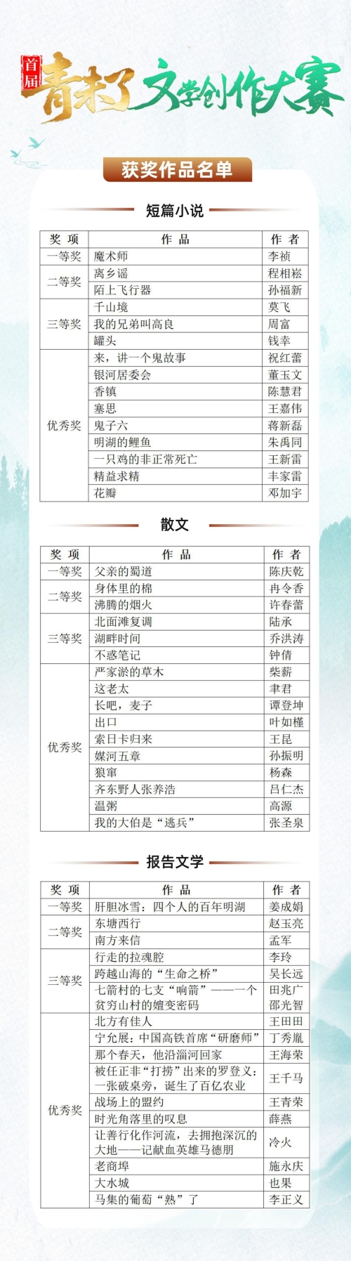 10月29日,由山东省作家协会与山东数字文化集团联合主办,齐鲁晚报・齐鲁壹点、山东省作协文学创作室(山东省文学馆)共同承办的首届“青未了”文学创作大赛获奖名单正式公布。来自全国各地的47位创作者脱颖而出,分获短篇小说、散文、报告文学三大类奖项,用文字勾勒新时代文学图景。