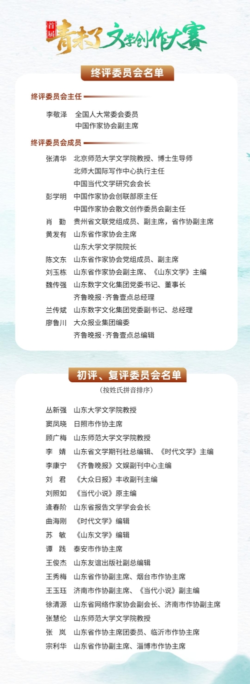 10月29日,由山东省作家协会与山东数字文化集团联合主办,齐鲁晚报・齐鲁壹点、山东省作协文学创作室(山东省文学馆)共同承办的首届“青未了”文学创作大赛获奖名单正式公布。来自全国各地的47位创作者脱颖而出,分获短篇小说、散文、报告文学三大类奖项,用文字勾勒新时代文学图景。