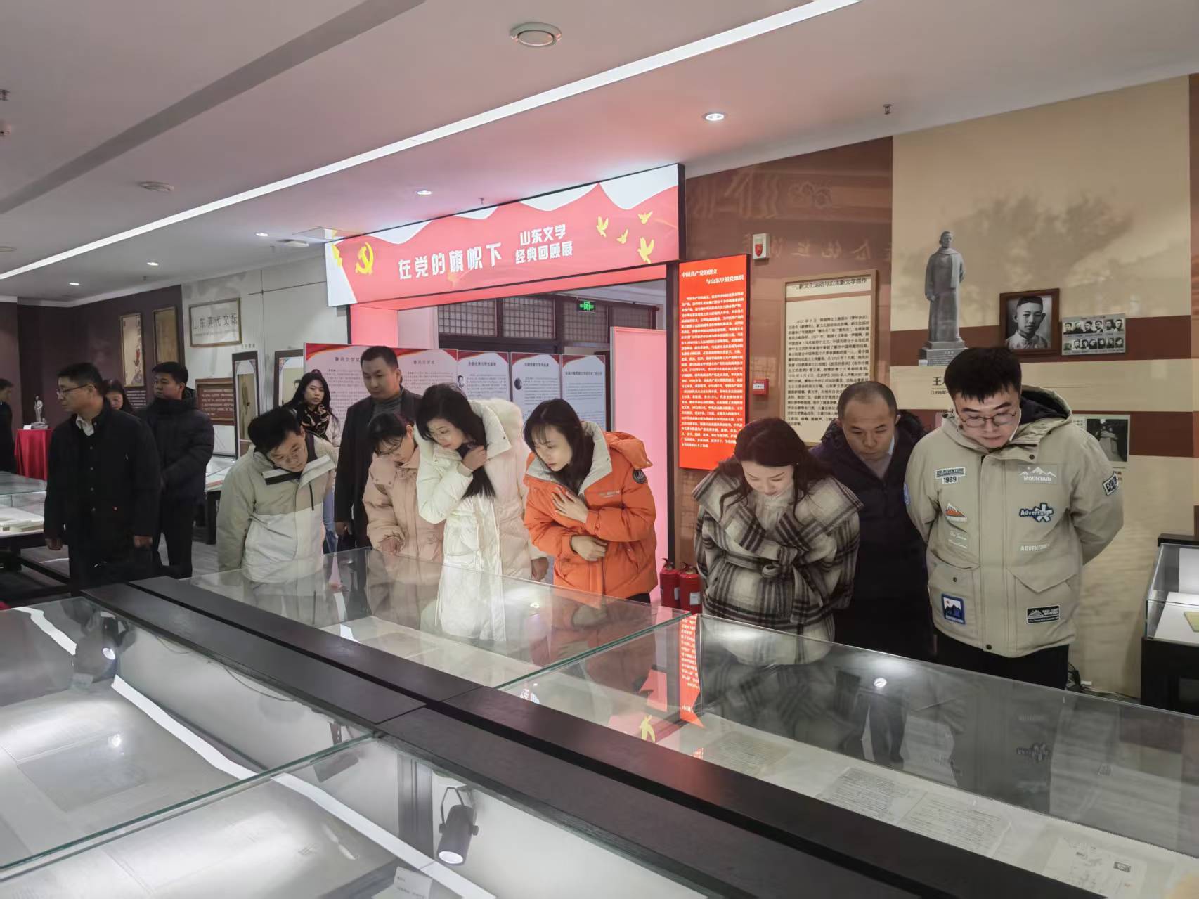 青年代表们实地参观山东省文学馆及山东省抗战题材文学精品展,深入了解文学馆功能布局、展陈设计、文献收藏情况,依次参观文学馆序厅、名篇名作墙、名人墙、山东文学发展脉络展、“在党的旗帜下——山东文学经典回顾展”等展区。同时参观了从抗战初期到当下期间山东作家创作的70多部产生广泛影响的抗战题材文学精品。